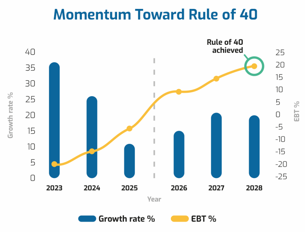 While growth remains strong, our strategic focus is profitability. We’re shifting from scale-first to profit-driven growth, with positive EBT in clear sight, surpassing rule of 40 in 2028.