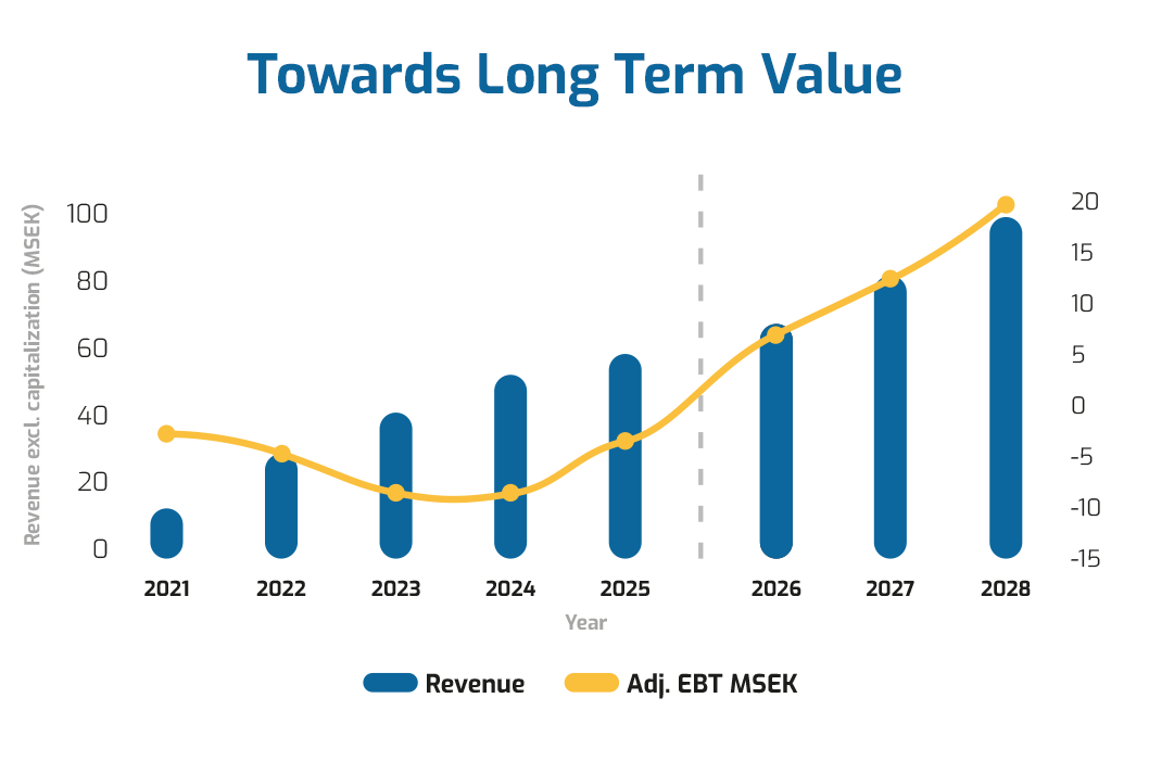 The group has doubled its total revenue since 2022, growing from SEK 30 million to 60 million in 2025, excluding capitalized development. Our sights are set on reaching 100 million by 2028.